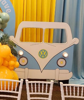 Blue wooden camper van prop.