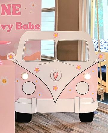 Pink wooden camper van prop.