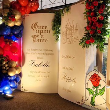 Step into a fairytale with this breathtaking 7 ft tall x 8 ft wide 3D storybook backdrop, crafted from wood for sturdy, lasting beauty! Each side of the “book” measures 4 ft wide, creating a dramatic, enchanting scene perfect for princess parties, enchanted garden themes, or magical photo moments. Includes a customizable name on the front cover.